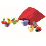 Zestaw zawiera: 15 gumowych figurek (winogrona, wiśnia, gruszka, marchewka, sałata, rzodkiewka, kurczak, owca, królik, pszczoła, biedronka, motyl, wiaderko, konewka, taczka), tarczę do losowania z 5 kategoriami (owoce, warzywa, zwierzęta, owady oraz akcesoria), woreczek.