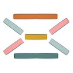 W komplecie 10 podłużnych członów z wytłoczonymi wzorami i antypoślizgowym spodem, które łączone parami tworzą 5 belek o długości ponad 80 cm każda. Belki są w 5 różnych kolorach.