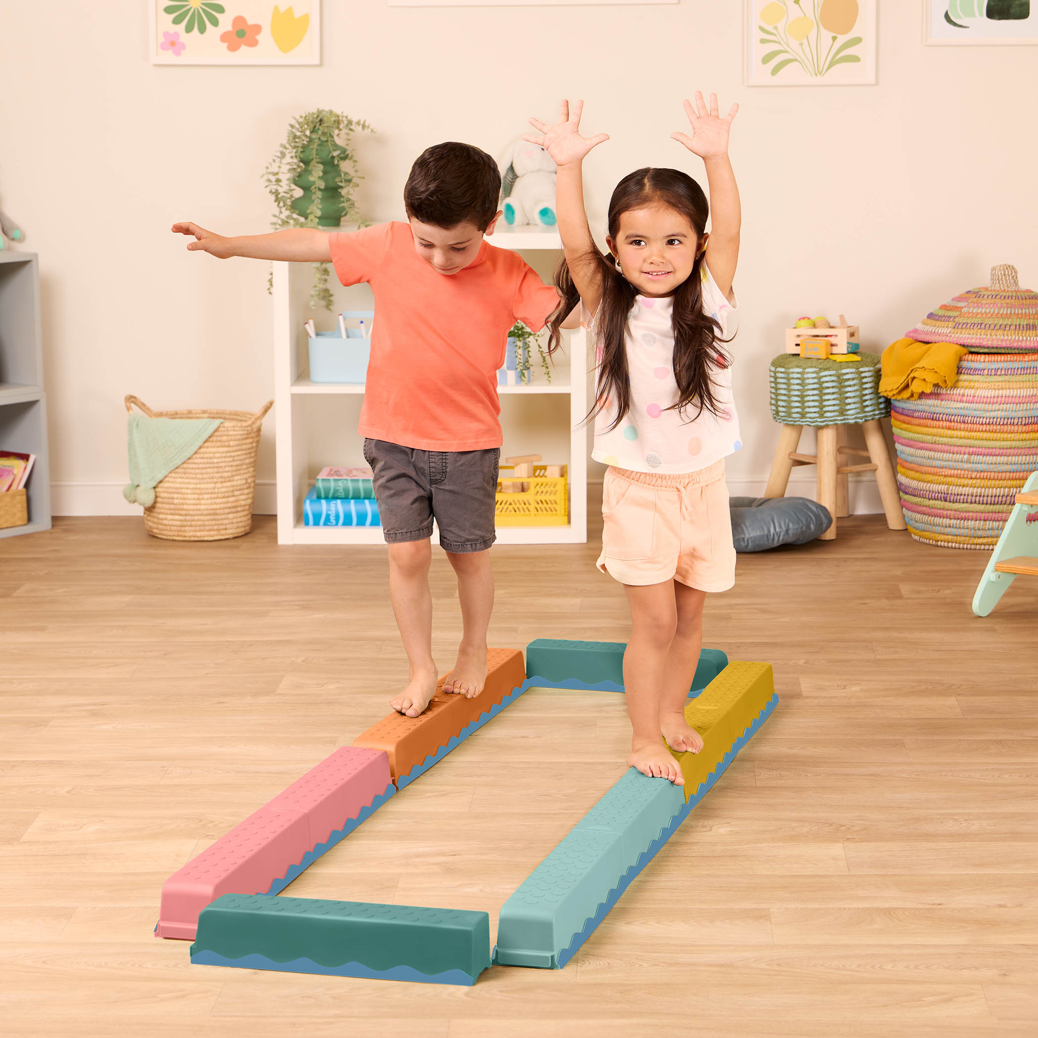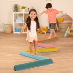 Zestaw prostych, ale pomysłowych elementów, które zapewnią aktywną zabawę angażującą całe ciało. Radość tworzenia wyzwań i mierzenia się z nimi. Można tworzyć różne scenariusze zabaw: przeprawa przez rzekę po belkach, zygzakowaty tor, jedna długa belka i inne. Belki można ustawiać w różnych konfiguracjach i różnych odstępach od siebie, aby urozmaicić zabawę. Inspiracje na załączonych zdjęciach oraz na opakowaniu produktu.
