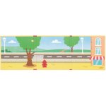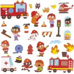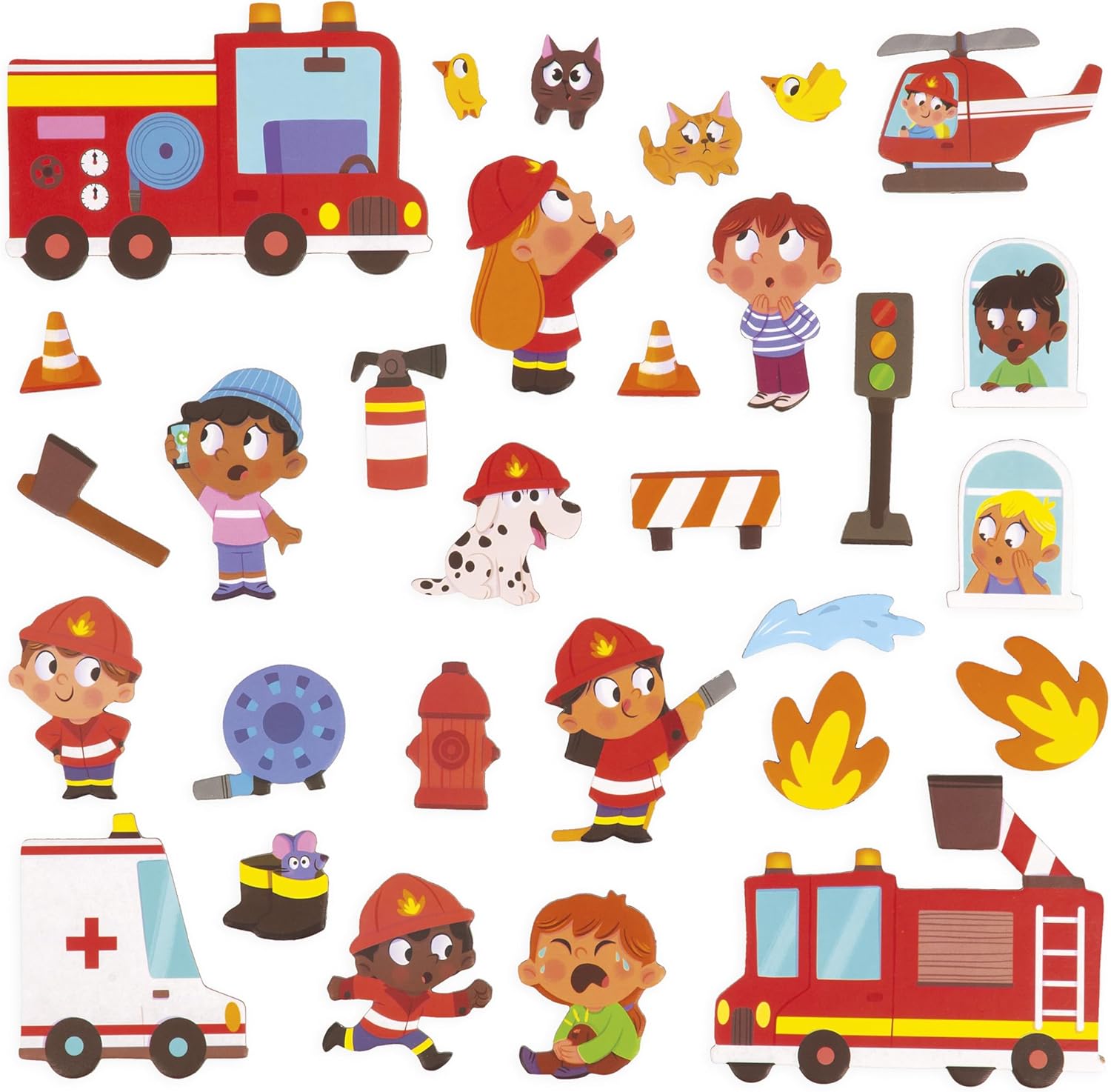 Układanka zawiera 30 magnesów przedstawiających: strażaków, ogień, zwierzęta, pojazdy i wyposażenie ratownicze. Elementy te stanowią części składowe do stworzenia oryginalnej ilustracji na rozkładanej potrójnej planszy. Magnesy pozwalają na układanie wymyślonych przez siebie opowieści, których bohaterami są strażacy w akcji. To świetna rozrywka dla wszystkich twórczych dzieci
