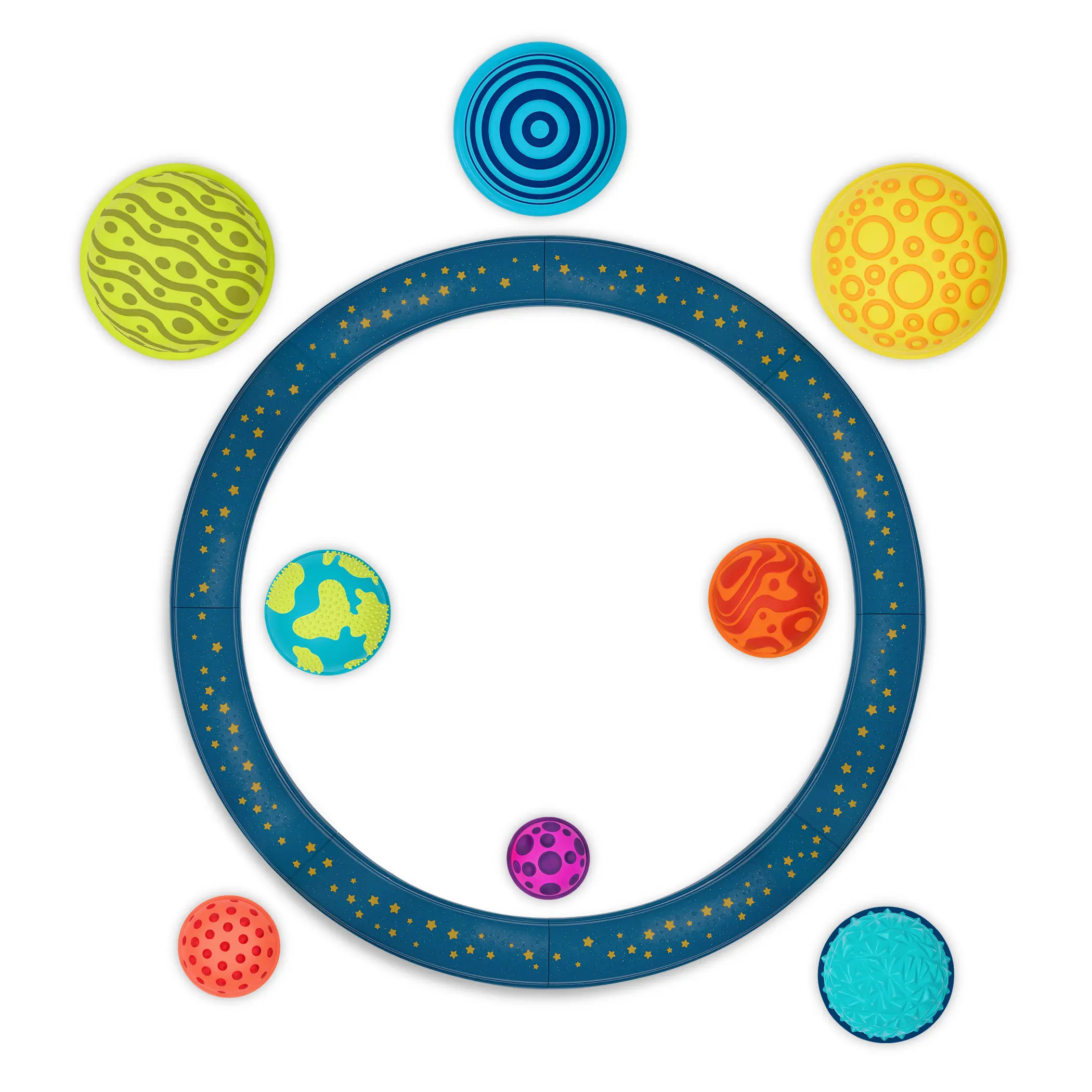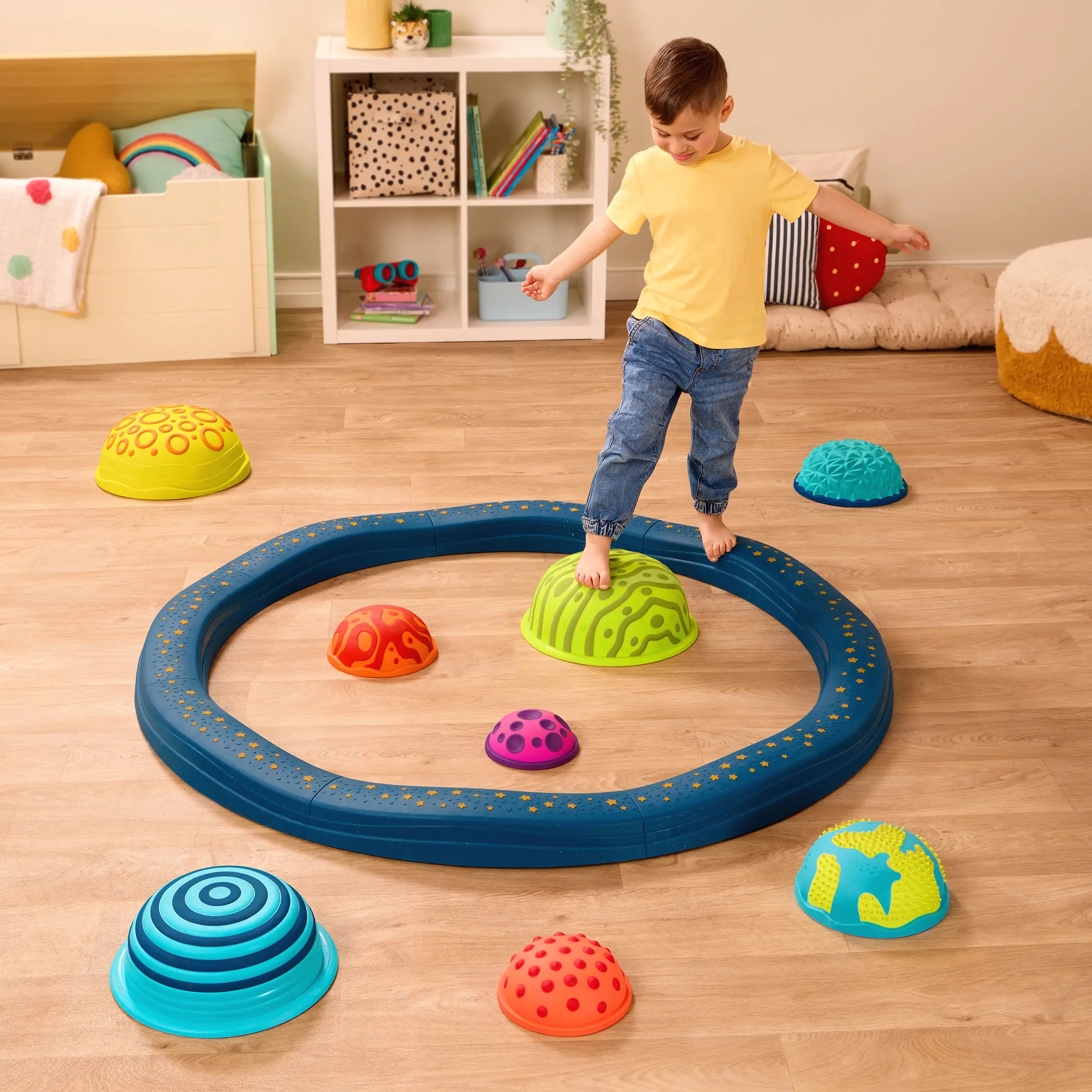 Ścieżka sensoryczna z planetami. Zestaw belek równoważnych z polami sensorycznymi. Planet Hopper Sensory Balance Set kanadyjskiej firmy B.toys.