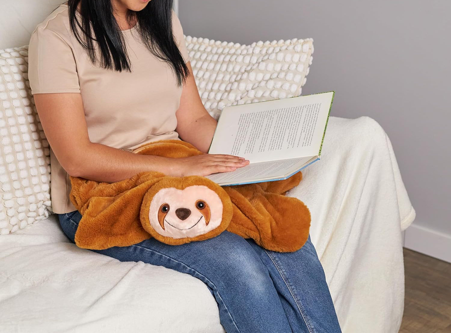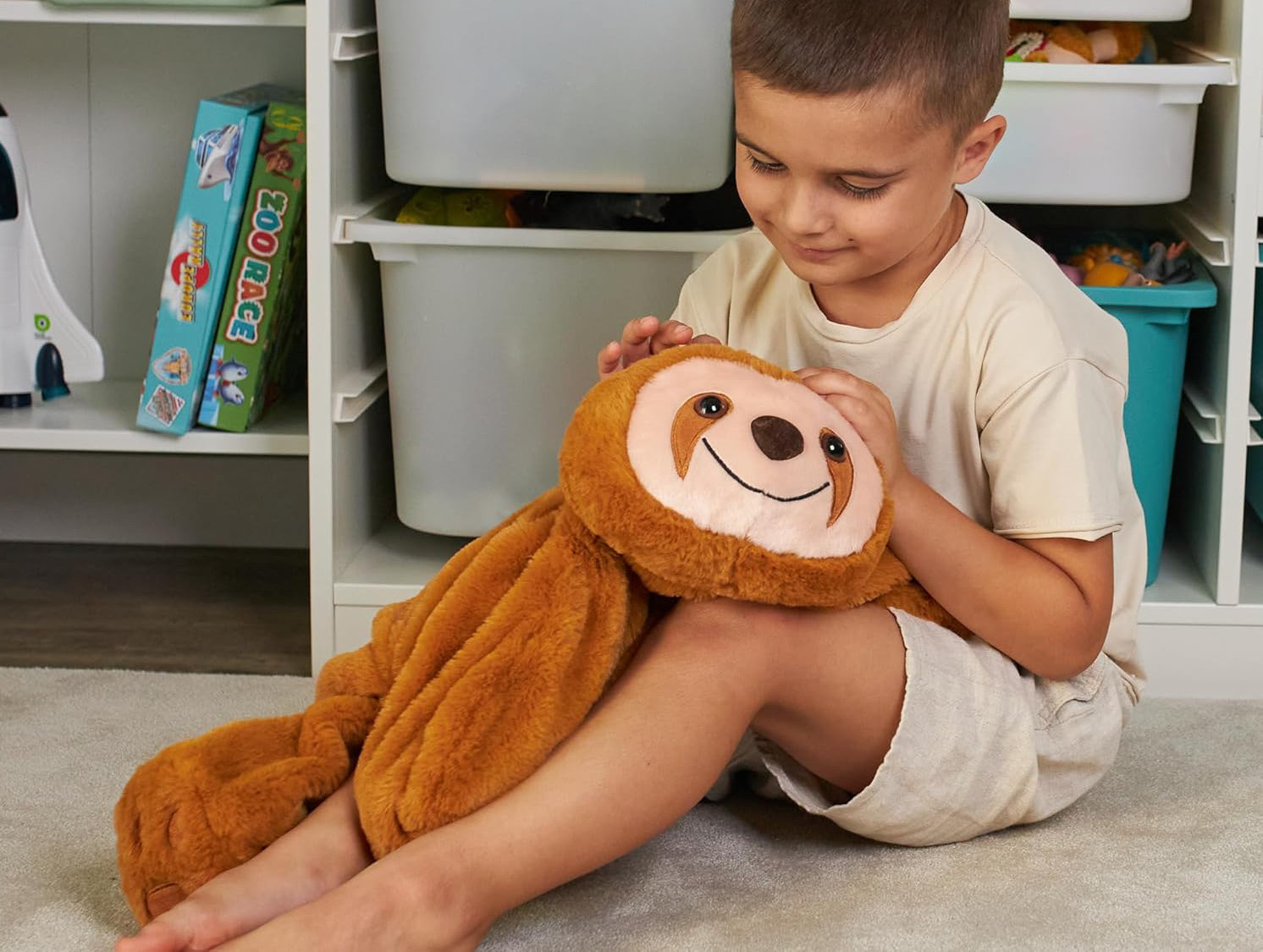 Miękki leniwiec o wymiarach 62 x 50 cm może towarzyszyć dziecku w wielu sytuacjach: w czasie nauki, relaksu, w podróży czy podczas drzemki. Wystarczy położyć go na kolanach, ramionach czy tułowiu - i cieszyć się kojącym efektem delikatnego nacisku obciążonego pluszaka.
