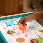 Interaktywny pulpit świetlny dla dzieci 3 l+ z mnóstwem akcesoriów. Kreatywna zabawka edukacyjna inspirowana Montessori. Różne kolory światła, cyfry 3D, kształty i szablony - nauka, sensoryka i zabawa w jednym. Możliwość zasilania przez USB lub przez baterie.
