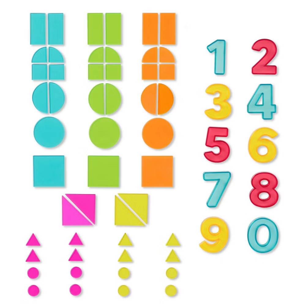 - 50 kolorowych, przezroczystych kształtów geometrycznych - do tworzenia kompozycji i obrazków, a także do eksperymentowanie z nakładaniem barw,