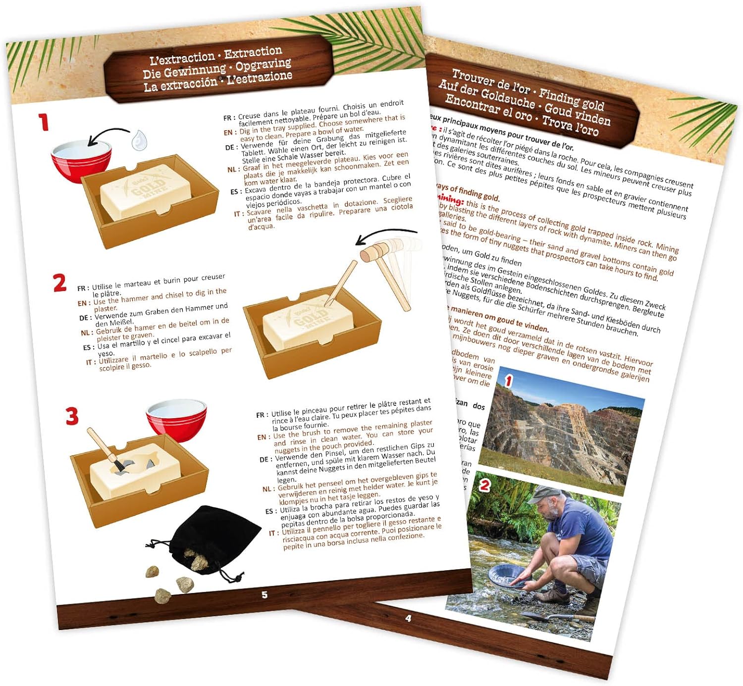 Dwie techniki poszukiwania złota do odkrycia: płukanie w celu oddzielenia złota od piasku i wydobycie w celu wykopania bryłek tzw. "złota głupców" (pirytu).