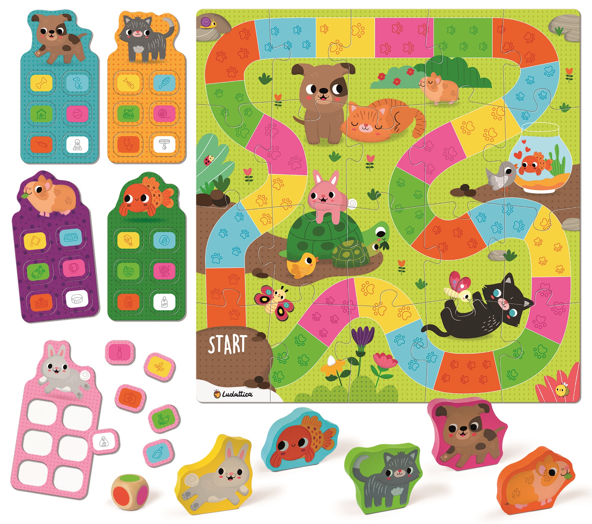 Po ułożeniu planszy z dużych puzzli i dokonaniu wyboru zwierzątka - pionka, gracze dobierają planszę z z zadaniami do swojego zwierzątka. Każdy gracz wyjmuje z karty pupila wszystkie 6 żetonów i kładzie je obok swojej karty. Gracze umieszczają swoje pionki-zwierzątka na brązowym polu startu i po kolei rzucają kostką, przesuwając swojego pupila - zgodnie z kierunkiem wskazanym przez ślady łap - na pole o kolorze wylosowanym na kostce. Po przesunięciu pionka na dane pole, gracz umieszcza w swojej karcie żeton odpowiedniego koloru. W ten sposób nie tylko trenuje się rozpoznawanie kolorów i uczy ich nazw, ale również poznaje i określa czynności związane z posiadaniem zwierzątka. Zwycięzcą jest ten, kto pierwszy skompletuje całą kartę swojego pupila, ale uwaga, aby zdobyć żeton z medalem, należy minąć pole START.
