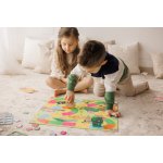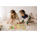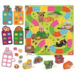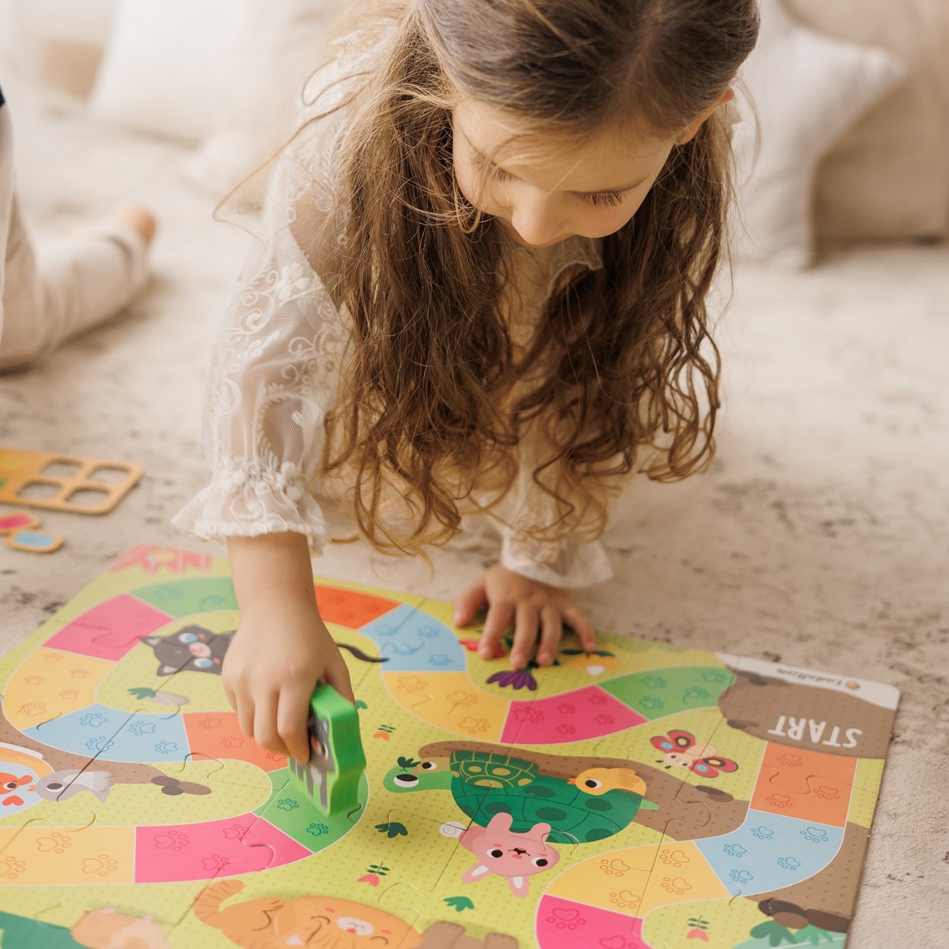 Duże puzzle - masywne elementy kilkanaście na kilkanaście centymetrów - tworzą po ułożeniu planszę o wielkości 50 x 50 cm do oryginalnej gry z dużymi drewnianymi pionkami w kształcie zwierząt i dużą kostką do gry z kolorowymi ściankami.