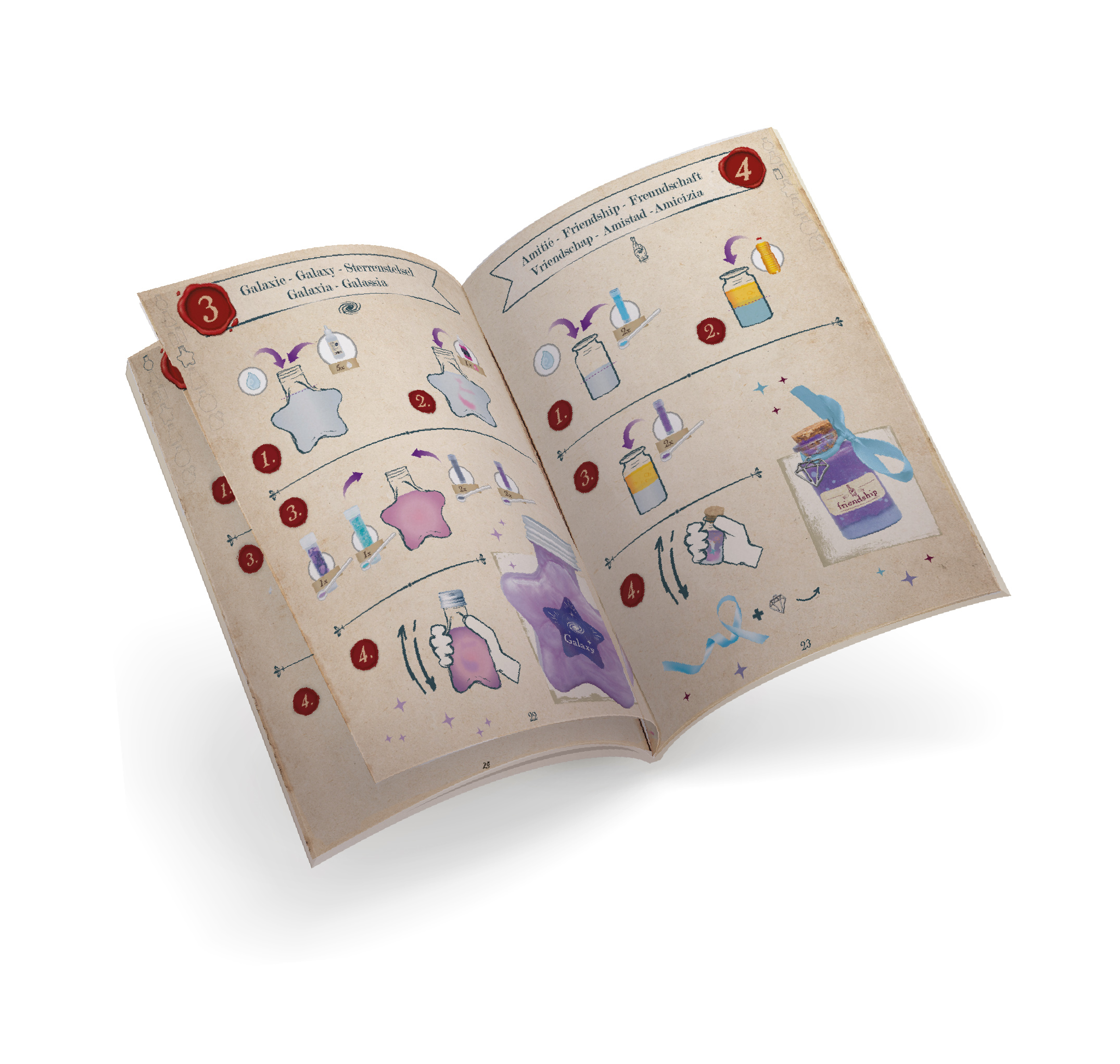 W instrukcji znajduje się 5 eksperymentów, które można przeprowadzić w kociołku. Zobacz eksplozję piany, stwórz lampę lawę lub własnego slime'a!
