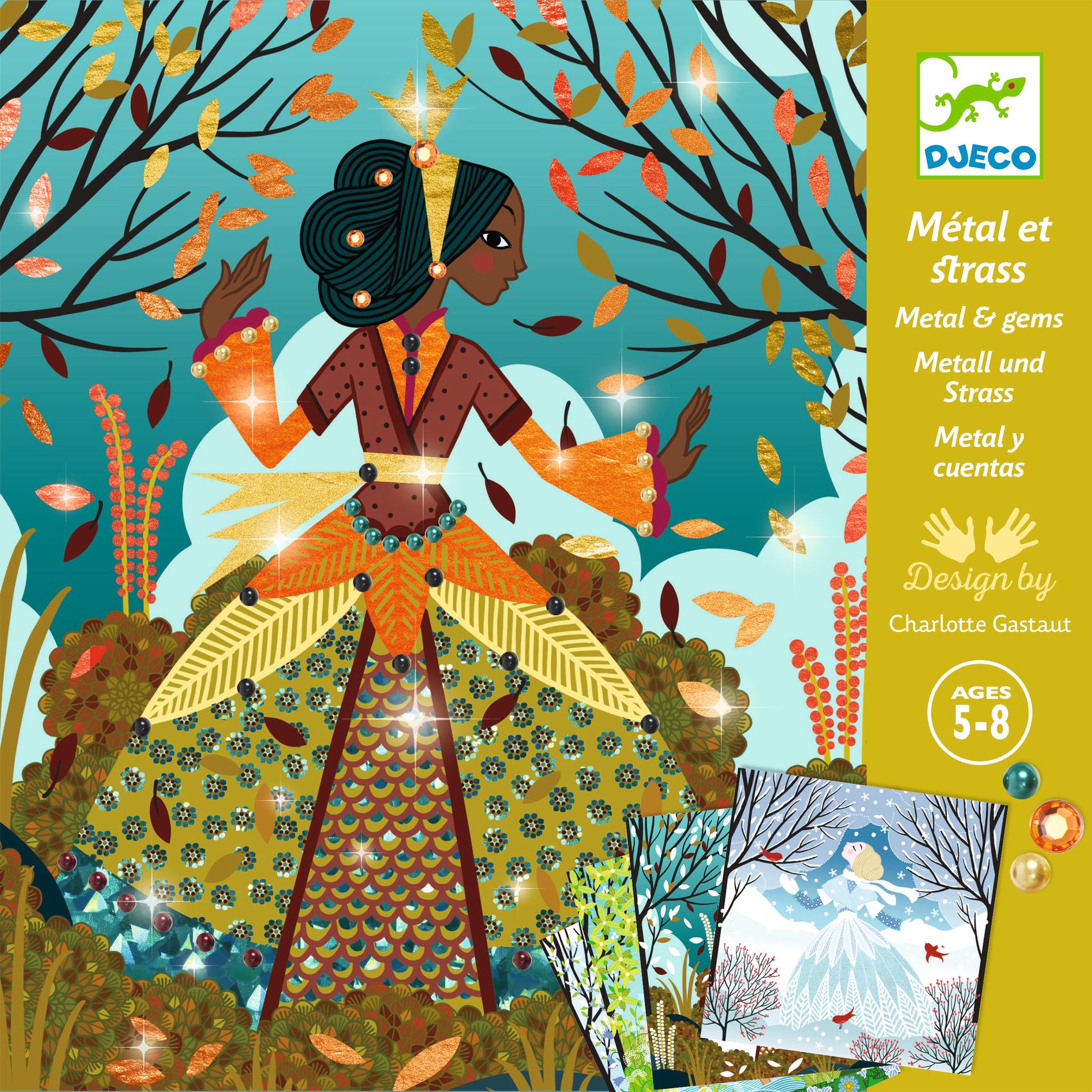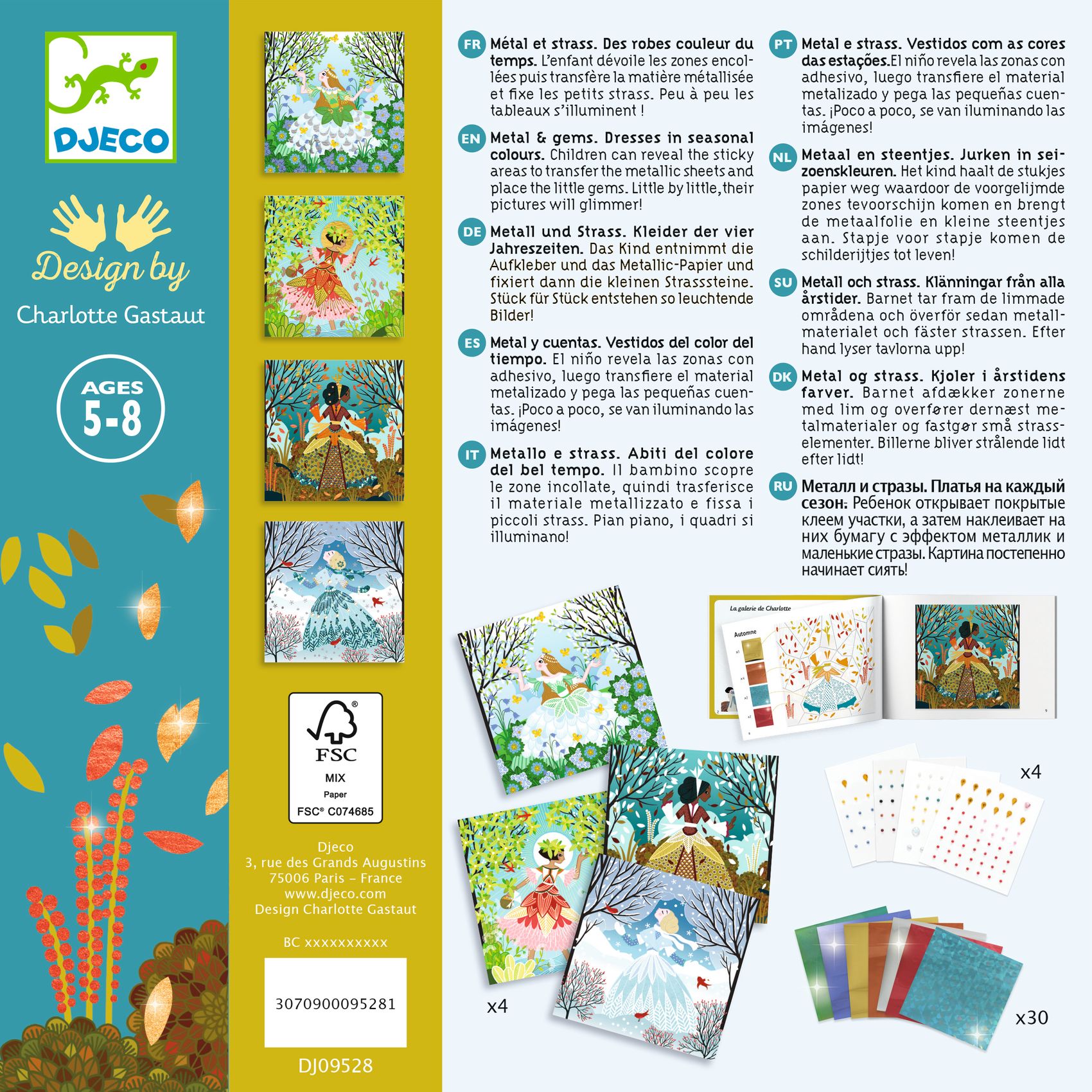 Cztery obrazy przedstawiają panią wiosnę, lato, jesień oraz zimę, które czekają na ozdobienie swoich sukien. Wystarczy odkleić papier ochronny z części obrazka, którą planujemy ozdobić, aby odsłonić samoprzylepną warstwę. Następnie przykładamy do niej wybrany arkusz folii transferowej, pocieramy i odklejamy, ujawniając kolorowy element. Instrukcja krok po kroku podpowiada, który kolor folii należy umieścić w danym miejscu lub jakie kamyczki przykleić.
